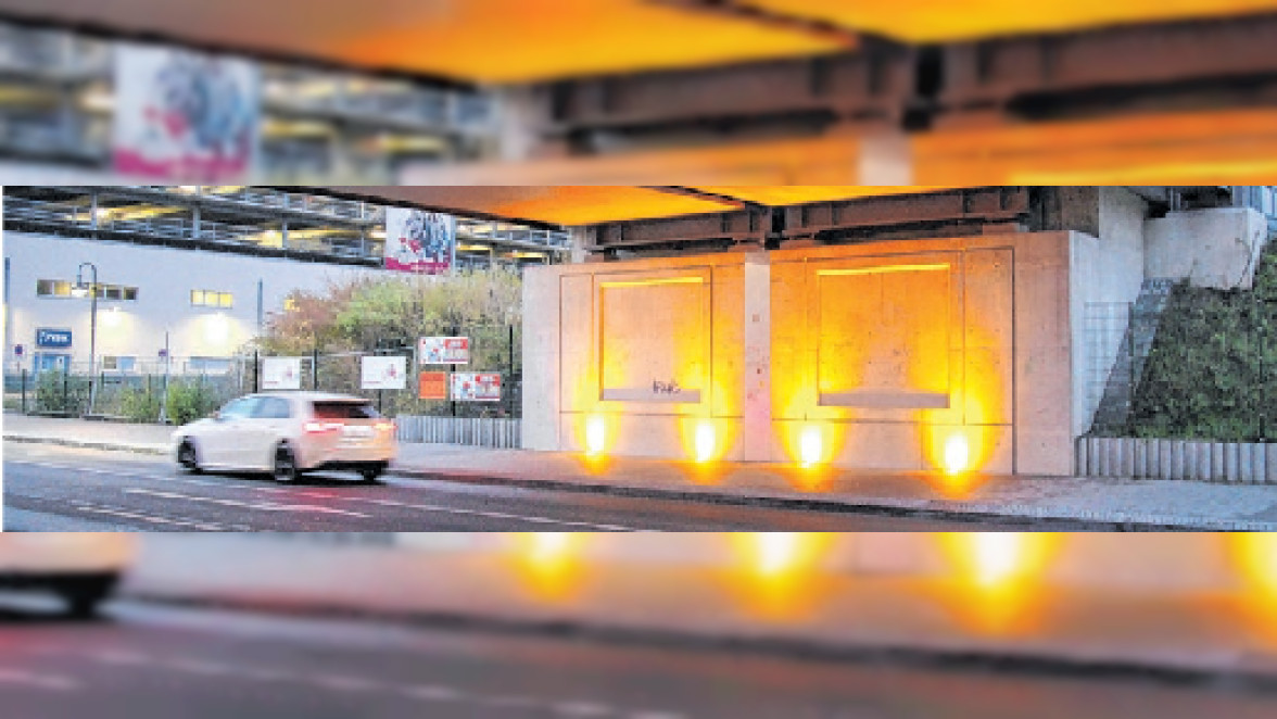 Nachtschwärmer und Frühaufsteher werden beim Passieren der neuen Bahnbrücke an der Börnicker Straẞe in warmes gelb-oranges Licht getaucht. Acht Unterflur-Leuchten strahlen die Brücke von der Abenddämmerung bis zum Morgengrauen von unten an. Die Elemente sind so gekoppelt, dass sie mit der Straßenbeleuchtung einund ausgeschaltet werden.