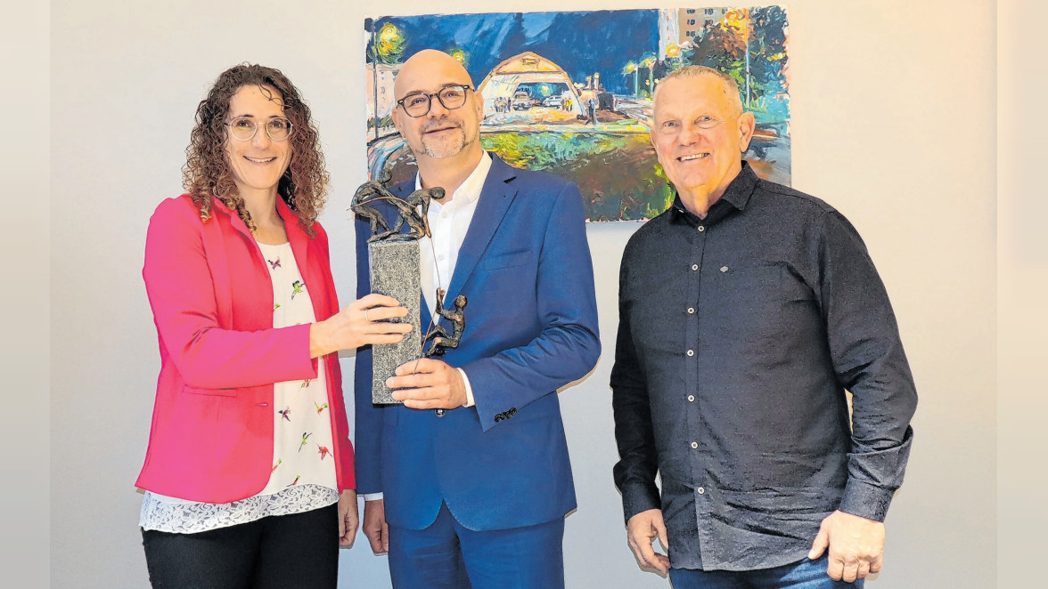 Mitten im Wahlkampf war der OB beim Erdgasbusziehen kurzfristig beim Team „Lebenshilfe-Wichern“ unterstützend eingesprungen. Gemeinsam wurde hier also schon kräftig an einem Strang gezogen. Jetzt übergab Uwe Köppen passenderweise eine Skulptur an den neuen OB von Frankfurt. Zu sehen sind zwei Menschen, die eine weitere Person zu sich in die Höhe ziehen.