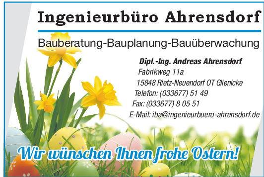 Sie können das Ingenieurbüro Ahrensdorf telefonisch unter +49 33677-5149 oder per E-Mail an iba@ingenieurbuero-ahrensdorf.de kontaktieren.