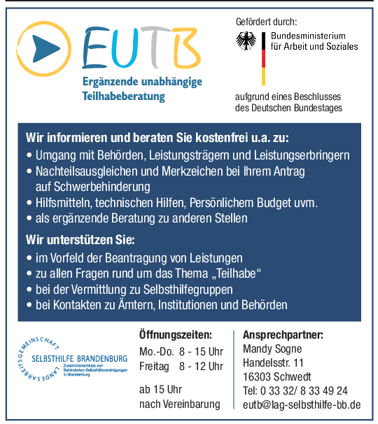 Die Ergänzende unabhängige Teilhabeberatung (EUTB®) ist eine bundesweit aktive Beratungsstelle, die sich auf die Unterstützung von Menschen mit Behinderungen, Personen mit drohender Behinderung sowie deren Angehörigen spezialisiert hat. Ihr Hauptanliegen ist es, die Selbstbestimmung und gleichberechtigte Teilhabe am gesellschaftlichen Leben zu stärken. Die EUTB® bietet ihre Dienste kostenfrei, unabhängig und neutral an zahlreichen Standorten an. Barrierefreiheit und Inklusion stehen dabei im Mittelpunkt, um möglichst vielen Ratsuchenden den Zugang zu erleichtern.