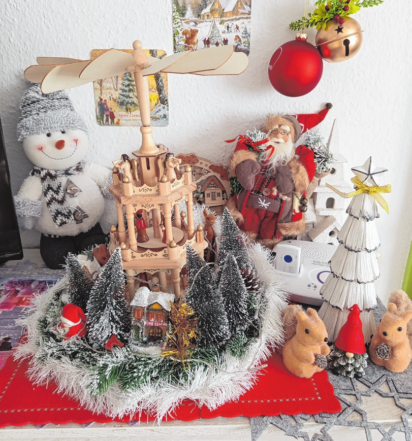 Auch 2025 macht sie ihrem Titel wieder alle Ehre: Ihre üppige Miniatur-Fantasiewelt sieht immer ein bisschen anders aus. Es tummeln sich Lebkuchen-Figuren, Schneemänner, tierische Gesellen und der ein oder andere Weihnachtsmann. Mutter und Sohn wünschen allen ein schönes Weihnachtsfest, Gesundheit und Frieden.
